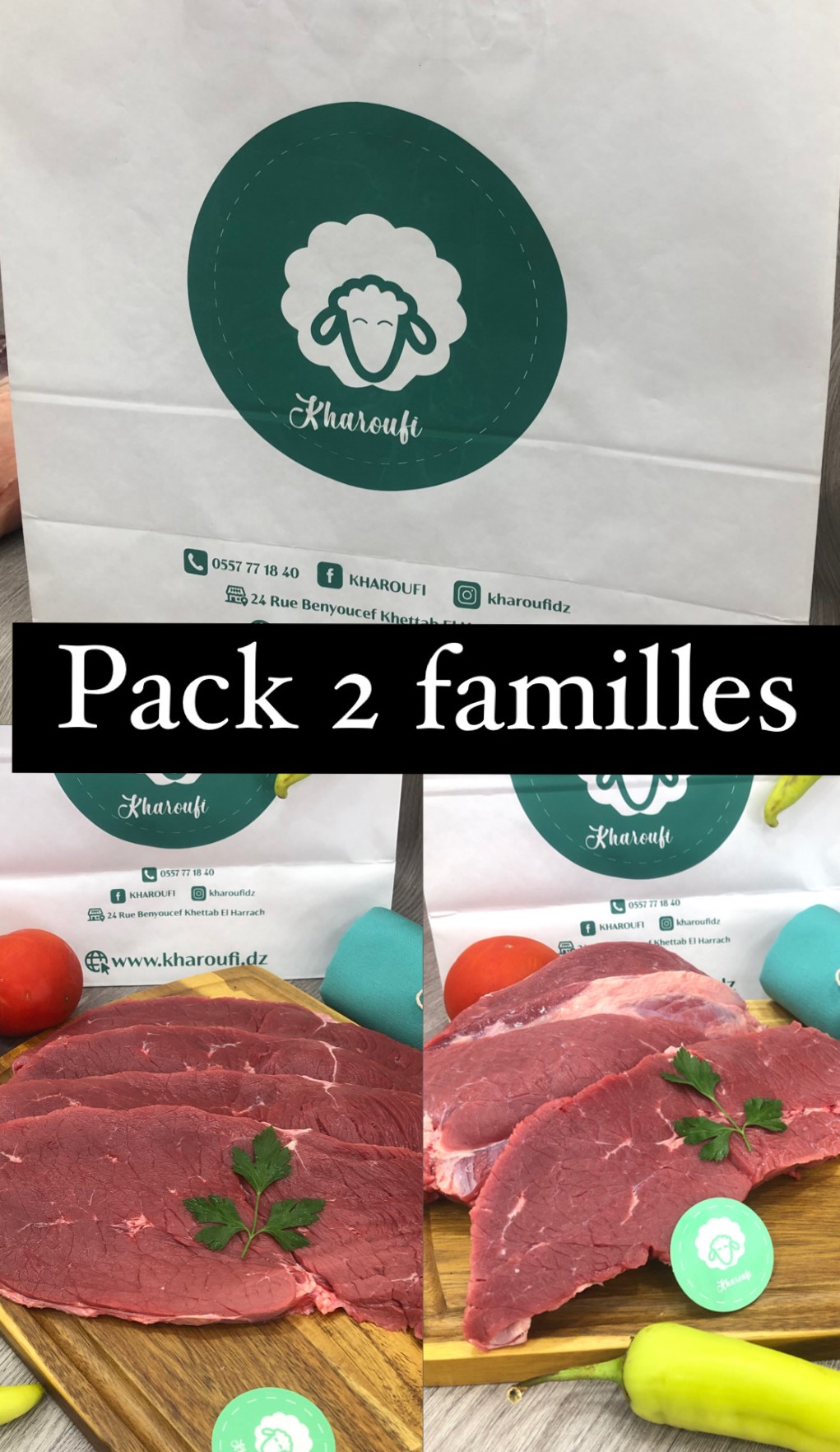 Ce pack est destiné à offrir une aide substantielle aux familles dans le besoin. En choisissant le Pack 2, vous contribuez à fournir des repas riches en protéines et en saveurs. Votre contribution de 8500 DA permettra de fournir 3 kg de steak, 2 kg de habra, et 1 kg de viande hachée, garantissant ainsi des repas nutritifs et variés pour les bénéficiaires.